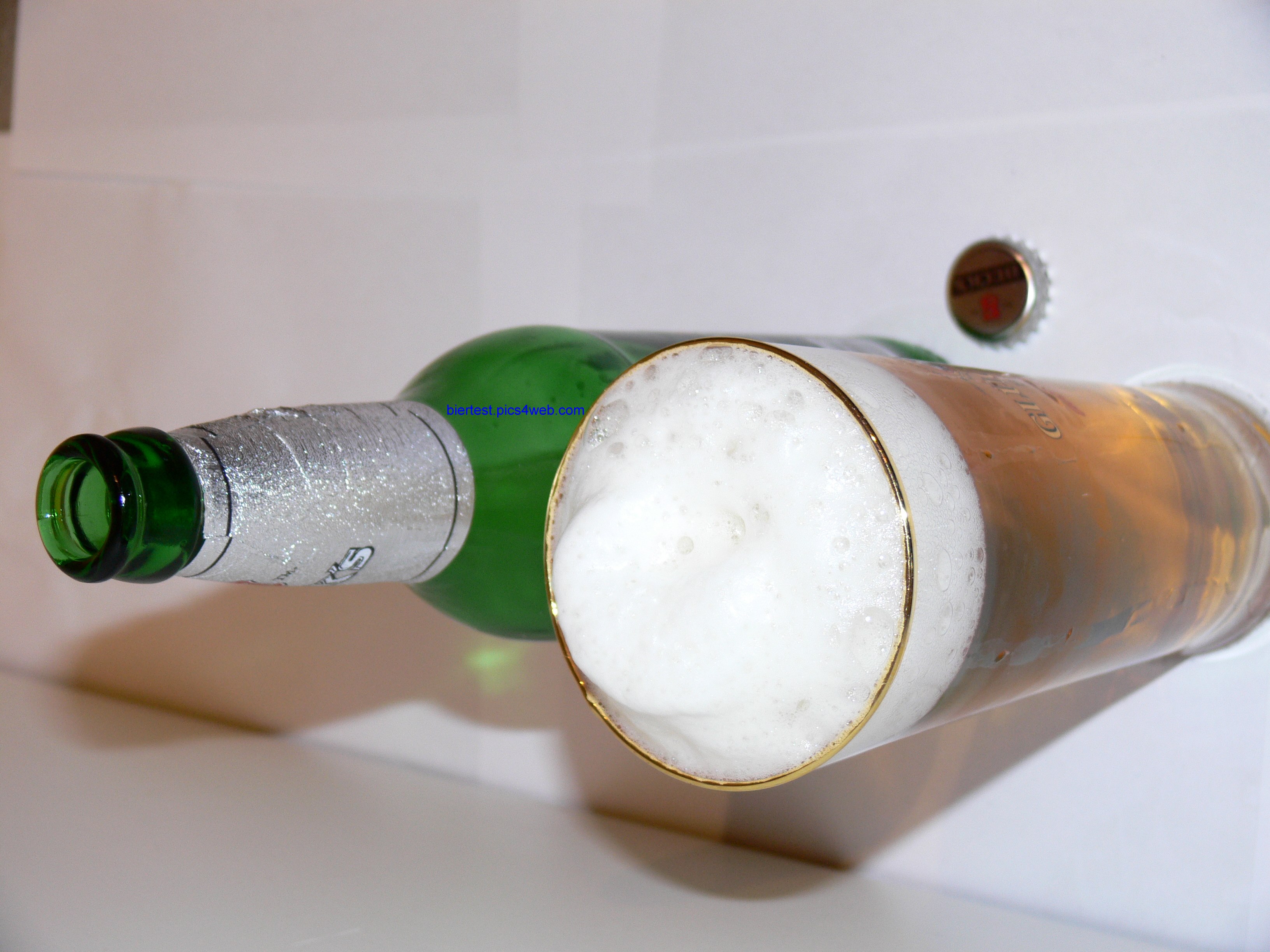Geruch: Hopfig getreidig, ein wenig süßlich. Mittelmäßig gelbe Farbe. Der Schaum hält sich mittelmäßig lange und ist größtenteils peinporig. Leichte Kohlensäure. Cremig anmutende Blume, fast wie Badeschaum. Ein wenig Schaum hält sich immer auf dem Bier, bis das Glas leer ist.