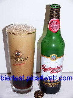 Ich teste hier das tschechische Original (mal wieder keine Kosten und Mühen gescheut). Typische Budweiserflasche und Etiketten, nur mit eben schwarzen Zusätzen (auch auf dem Silberpapier). Hat 4.7% alc. das Zeug und ist leider pasteurisiert, wie üblich in Tschechien (Bilder auf meiner Homepage).