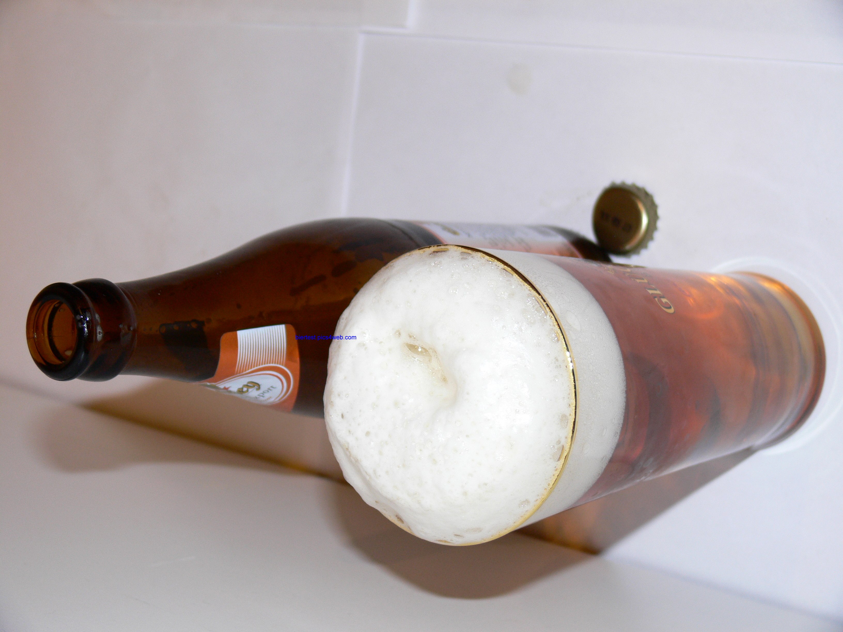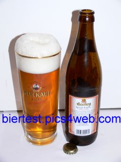 Geruch: sehr malzig, süßlich. Etwas dunkelgelbe Farbe, leicht golden. Schnelle und langsam aufsteigende Kohlensäure halten sich schwach die Waage. Der Schaum ist auch OK, ziemlich steif und cremig, nur leichte Grobporigkeit bei leicht überdurchschnittlicher Haltbarkeit.