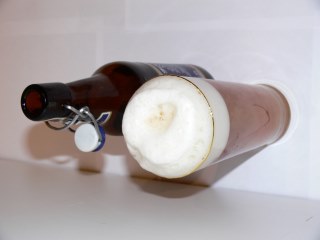 Mal sagen, ´nen kleinen hat er schon in der Krone, der Edelmann, der sich aus dem Tonkrug nochmal eine Mass nachschenkt. Macht mancher Biertester hier bestimmt genauso. Ansonsten dunkelblau und golden gehaltene Etiketten mit weisser Schrift. Farblich passender Gummiring am Keramikverschluss - nobel.