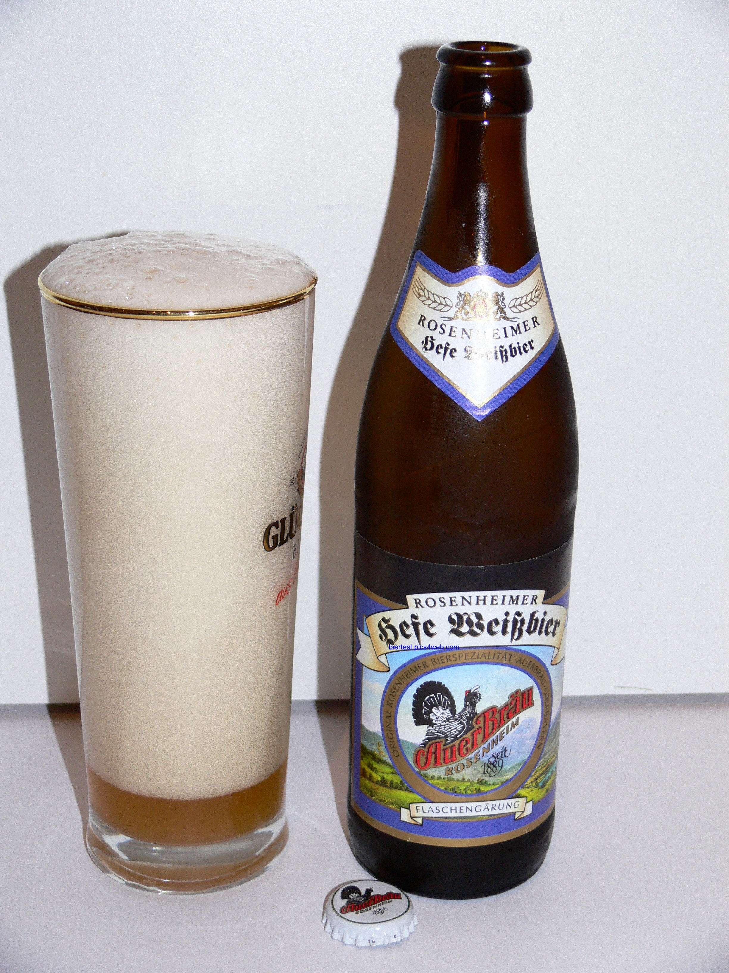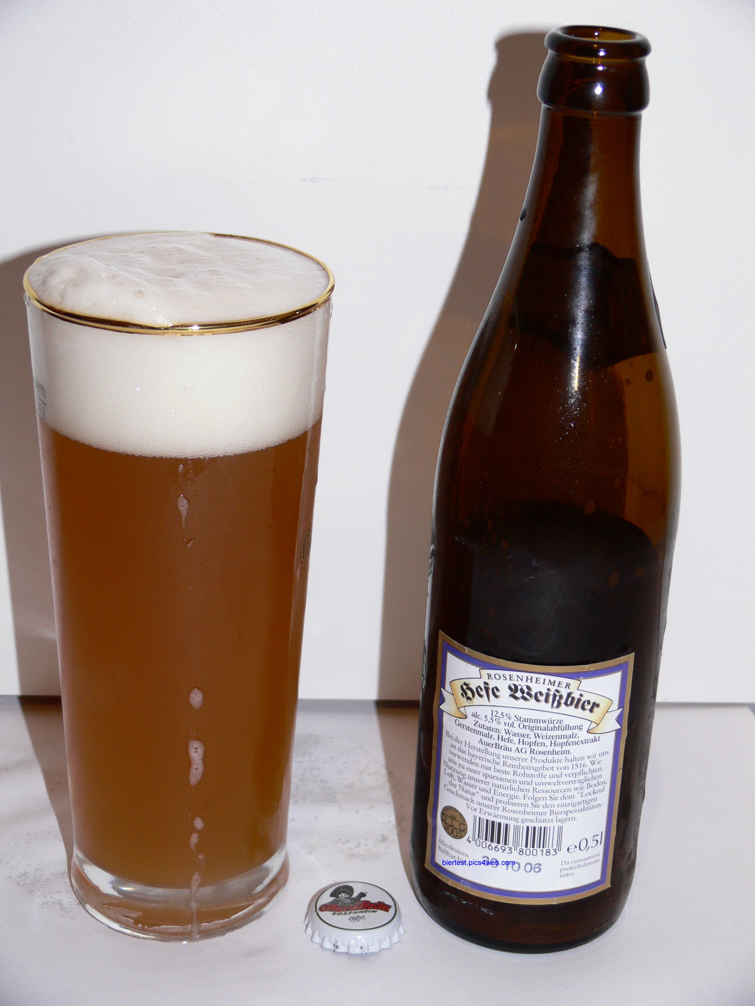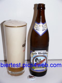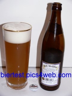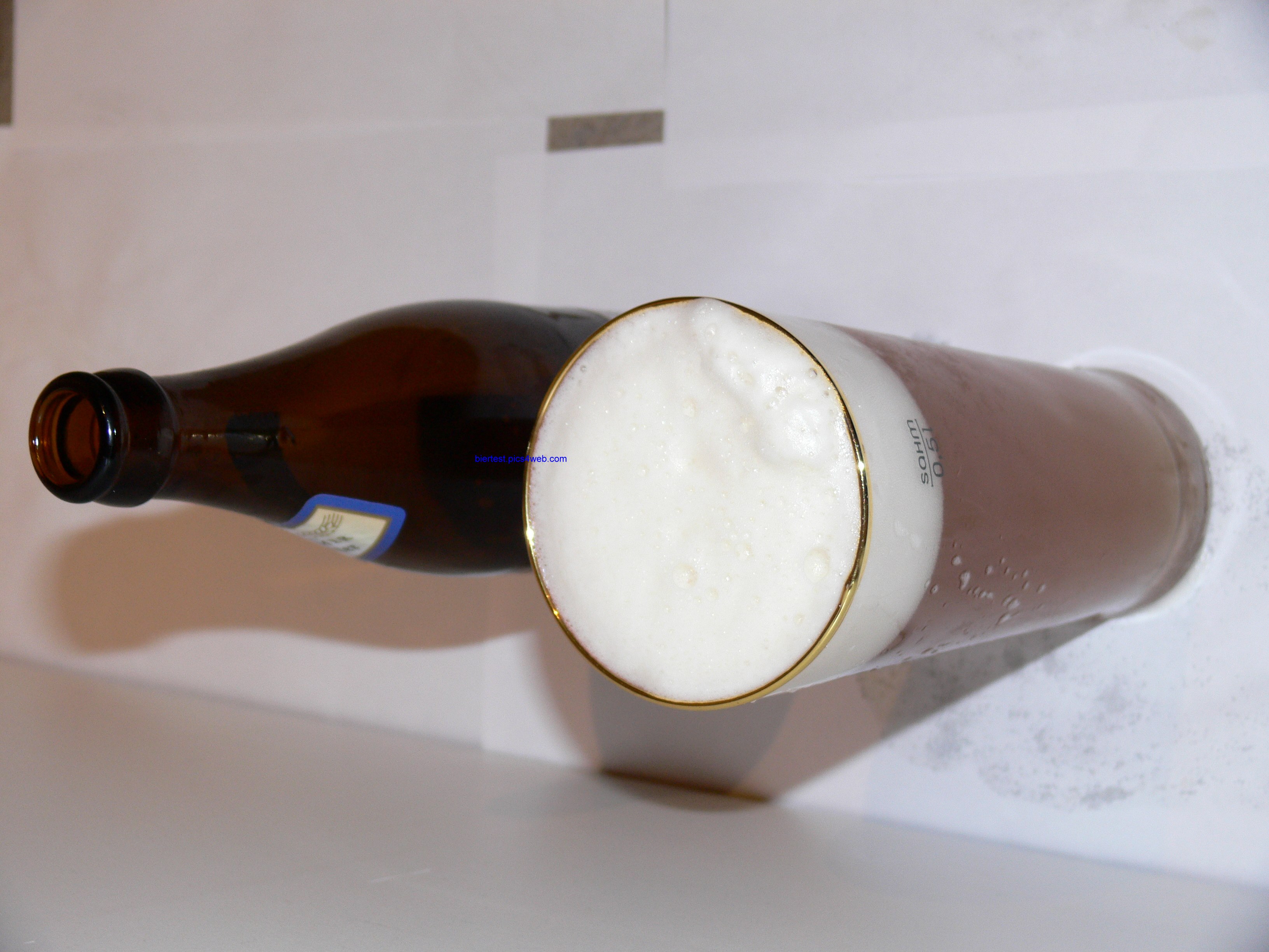 Geruch: nach Weizen mit fruchtigen, bananigen Elementen. Schaut wie das leicht dunklere Standartweizen aus, sehr trübe, deutlich sichtbare Kohlensäure bei einer hellorangenen, mit hellbrauen Farbelementen versehenen Biersuppe. Der Schaum ist sehr feinporig, sehr cremig und auch mit einer gewissen Steifigkeit. Hält sehr lange.
