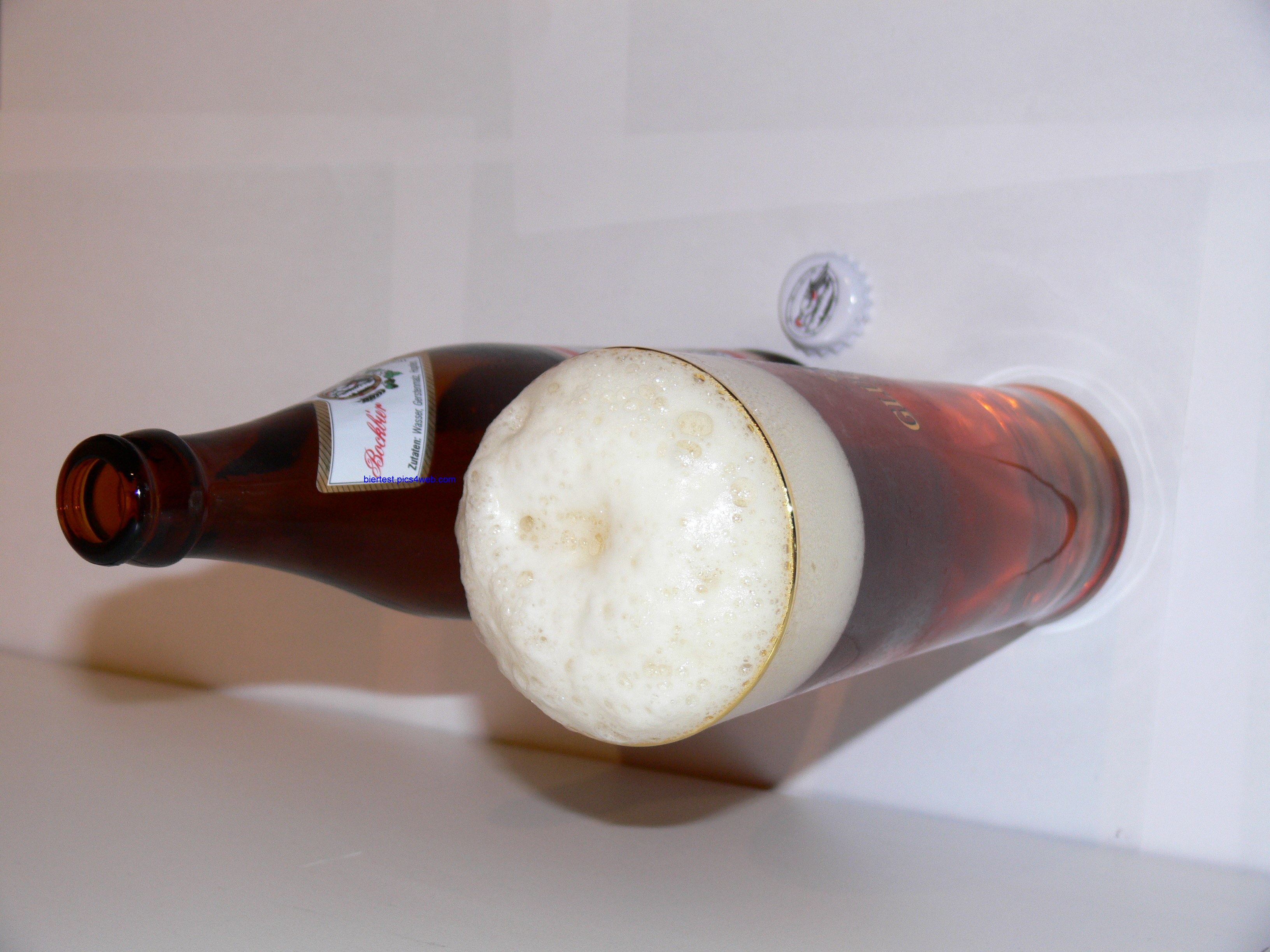 Geruch: diffus und schwach nach Irgendwas; minimal malzig, aber auch nur wenn man es riechen will. Flache Blume, leichte Grobporigkeit feststellbar. Die Blume hält durchaus lange. Schöne natürliche Kohlensäure. Wie beim standesgemäßen Bock üblich dunkelorangene Färbung des Bieres; jedoch habe ich auch schon Landbiere gesehen, die ähnlich dunkel waren.