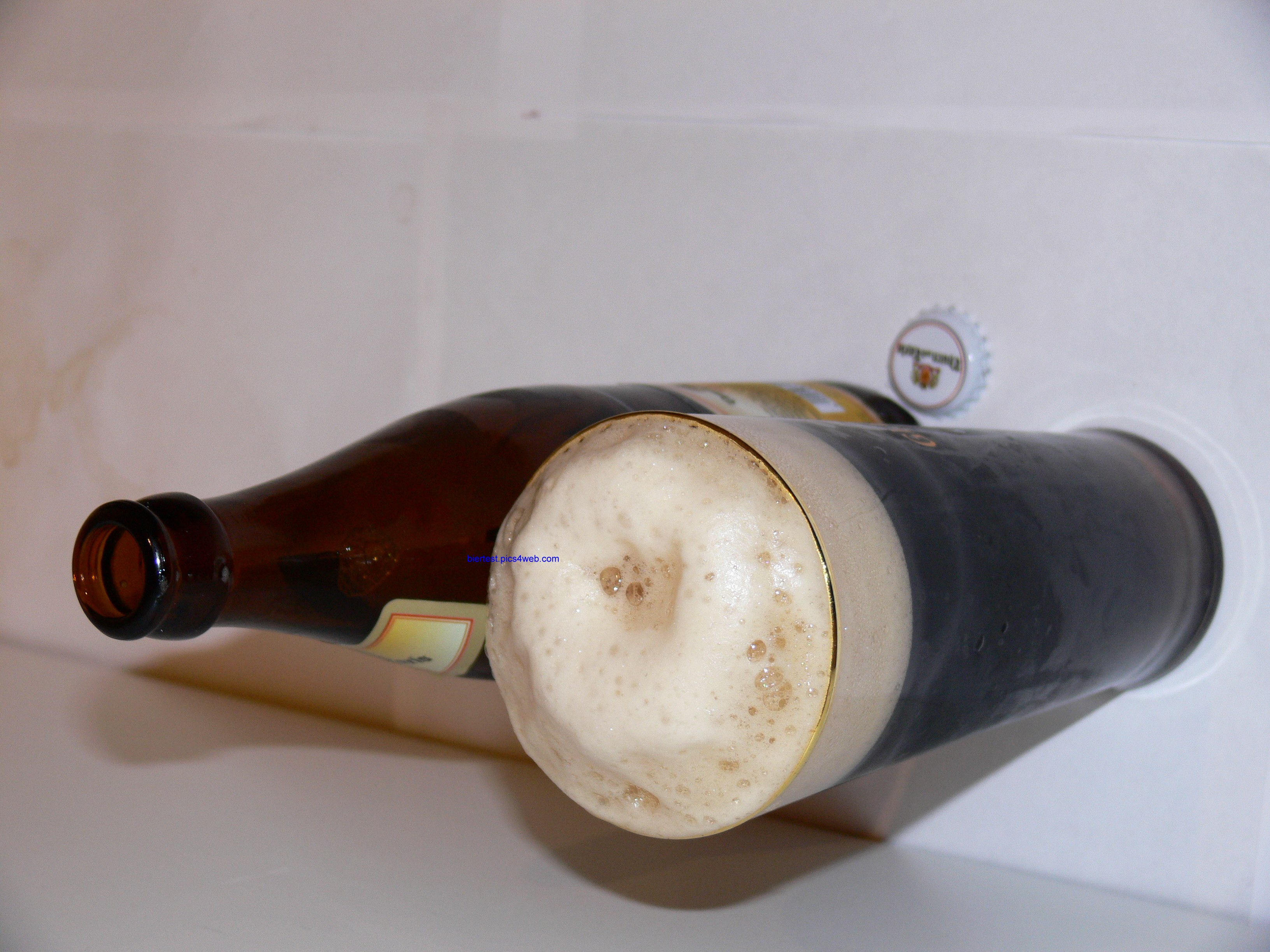 Geruch: tiefdunkel, nach Roggen und Malz. Schwer und würzig. Tiefdunkle Bernsteinfarbe, wie bestes Bockbier. Schwach aufsteigende schnelle und langsame Kohlensäure. Steifer Schaum formt eine schöne Krone, schwach grobporig versteht sich. Schön cremig dazu. Sieht toll aus und erschwert das Einschenken; im Testverlauf wirkt der Schaum auf dem Bier, als wenn er ausflockt.